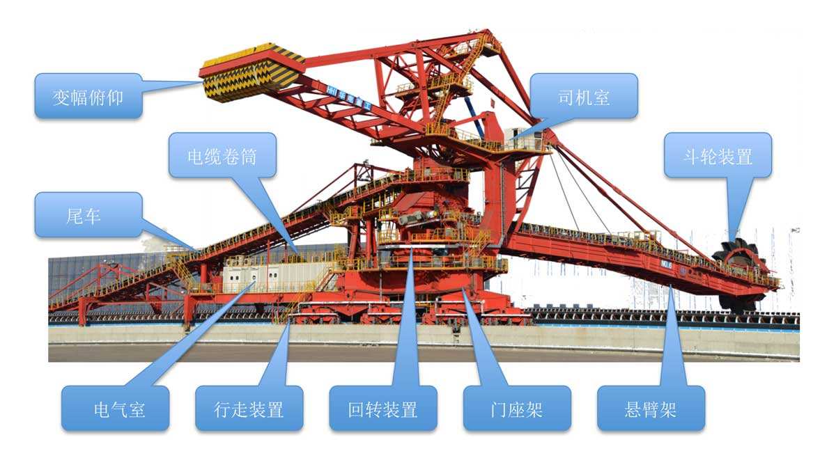 自動斗輪堆取料機 利用斗輪連續取料,用機上的帶式輸送機連續堆料的有軌式裝卸機械。它是散狀物料(散料)儲料場內的專用機械,是在斗輪挖掘機的基礎上演變而來的,可與卸車(船)機、帶式輸送機、裝船(車)機組成儲料場運輸機械化系統,生產能力每小時可達1萬多噸。斗輪堆取料機的作業有很強的規律性,易實現自動化。控制